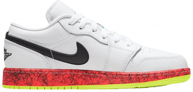 The Air Jordan 1 Low GS “Grades” is the youth sizing of Michael Jordan’s first signature shoe in a distinctly ’90s-style colorway. The low-top Jordan 1 is one of the most popular shoes in the Jordan lineup, and this “Grades” look, complete with neon orange, yellow, turquoise, and pink accenting is certainly no exception to the statement. A black leather Swoosh appears on either side of the shoe and black “Wings” embroidery can be found on the heel. The rest of the upper is outfitted in crisp white leather for an ultra versatile look. Elsewhere, black Jumpman detailing is stitched onto the white nylon tongue and contrasting “23” embroidery can be found on the lace overlay. An orange midsole with black swirls and a neon green outsole highlight the look of the left shoe. The right shoe features a magenta midsole with black swirls and a turquoise outsole.