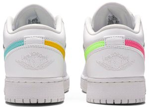 Made exclusively for big kids, the Air Jordan 1 Low GS White Neon updates the original 1985 silhouette as a minimalist low-top with vibrant, asymmetrical accents. The latter takes the form of Nike Swooshes in teal, yellow, neon green and pink, each standing out against a crisp white leather backdrop. Additional branding elements include an embroidered white Jumpman atop the tongue, along with a Jordan Wings logo on the heel.