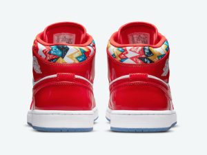 This mid-top Air Jordan 1 features White leather on the base while Red patent leather lands on the overlays and Swoosh logos. More Red hits the tongue label, liner, laces, and insoles while White adorns the Jumpman logos and midsole. Other highlights include a geometric print on the collar and an icy translucent outsole.
