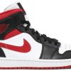 This mid-top Air Jordan 1 features White leather on the base while Red patent leather lands on the overlays and Swoosh logos. More Red hits the tongue label, liner, laces, and insoles while White adorns the Jumpman logos and midsole. Other highlights include a geometric print on the collar and an icy translucent outsole.