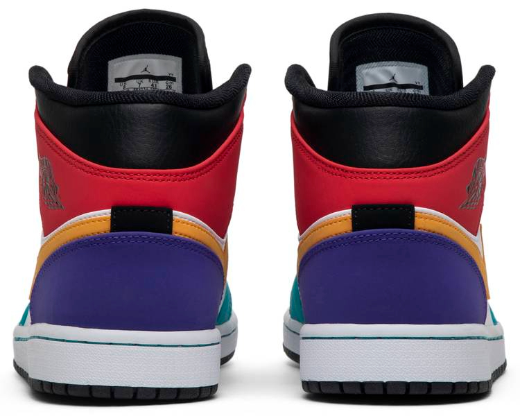 The Air Jordan 1 Mid ‘Multi-Color’ showcases a design that borrows from Nike’s ‘What The’ concept, bringing together clashing hues to accent a classic Chicago-inspired foundation. The latter is readily seen on the toe and collar, both rendered in black and red. A white leather quarter panel, overlaid with an orange leather Swoosh, is flanked by contrasting pops of Turbo Green and purple.