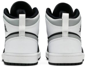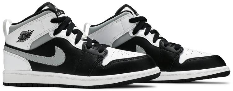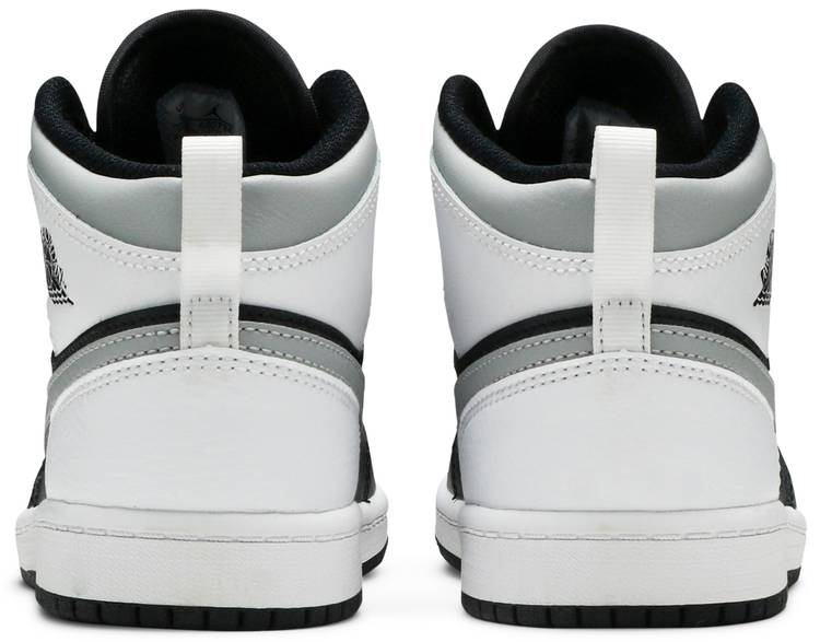 The Air Jordan 1 Mid PS “White Shadow” is the preschool sizing of Michael Jordan’s coveted first signature shoe in an easy-to-style colorway. The “White Shadow” appears on the Jordan 1 Mid silhoutte, one of the most popular looks in Jordan Brand’s line. Design details include buttery black leather on the toe cap, forefoot, and mid-panel. Contrasting white leather can be found on the perforated toe box, middle eyelet panel, collar, and heel. Branding appears in the form of a grey leather Swoosh on either side, a black “Wings” emblem on the collar, and white Jumpman on the tongue tag sewn onto the white nylon tongue. The white pull tab on the heel is a helpful design that makes wearing and taking off the shoe a breeze.