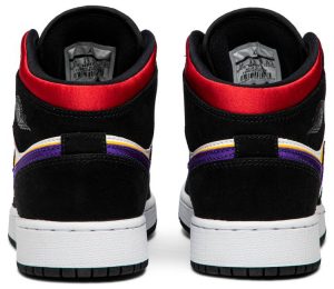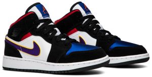 The Air Jordan 1 Mid SE GS Rivals takes the retro hoops silhouette and gives it a color collage celebrating the best of MJs competitors. Released in late June 2019 for kids, this mid-cut version of the 1985 icon honors the teams that challenged the Bulls for NBA supremacy in the 90s. A blue-and-orange tongue bows to the Knicks while a Bred collar nods to the Trailblazers. Swoosh branding has a purple-and-gold Lakers motif, and a blue toe calls out the Pistons.