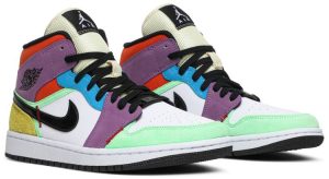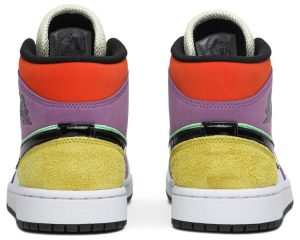 Air Jordan 1 Mid SE ‘Lightbulb’ showcases an array of mixed materials and hues on the upper. The design uses a white leather base, accented with patent leather detailing on the black Swoosh and blue eyestay. Suede paneling in green and yellow are applied to the toe and heel, while purple nubuck appears on the collar flap and forefoot overlay. Exposed zigzag stitching in contrasting red gives the shoe an unfinished look.