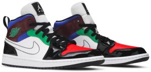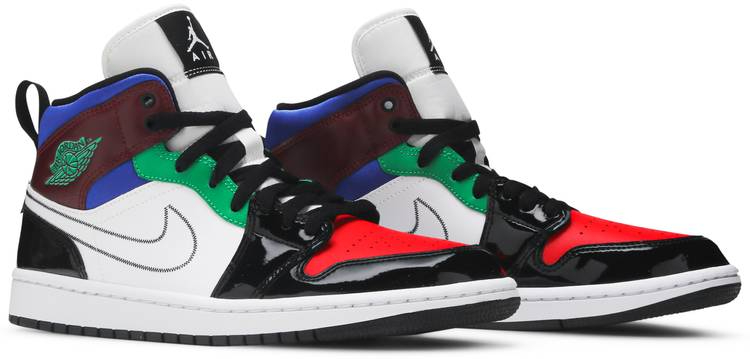 The Women’s Air Jordan 1 Mid SE “Multicolor” introduces a mismatched colorway to the iconic Air Jordan collection on the women’s sizing of Michael Jordan’s first signature shoe. The abstract “Multicolor” Jordan 1 Mid follows a similar design ethos to that of the “Patent Leather Multicolor” colorway of the same shoe. A burgundy leather overlay with green “Wings” branding appears on top of the blue leather base of the collar. The perforated toe features vibrant University Red leather and kelly green leather can be found on the middle segment of the eyelets. Glossy black patent leather overlays on the forefoot, bottom eyelet, and heel add balance to the design of the white leather mid-panel. Outline stitched Swoosh branding appears on either side of the Women’s Jordan 1 Mid “Multicolor” to complete the look. | Wmns Air Jordan 1 MID SE.
