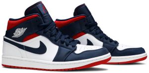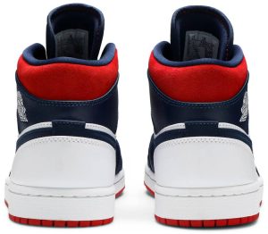 Suede sole The Air Jordan 1 Mid GS “USA” is the youth sizing of Michael Jordan’s first signature shoe dressed in a patriotic color scheme. Situated in the models mid-top height, this “USA” design for children features an Independence Day inspired look that can be worn throughout the year. Smooth white leather appears on the perforated toe, mid-panel, and heel. Navy blue nylon overlays dot the forefoot, eyelets, and collar. Additional nylon detailing appears on the blue Swoosh on either side. Classic “Wings” insignia is located on the ankle panel, and University Red suede wraps around the collar. Red Jumpman branding is located on the blue nylon tongue of this Air Jordan 1 Mid fitted in youth sizing