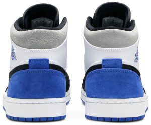 Suede sole The Air Jordan 1 Mid “Game Royal Black Toe” combines two of the most recognizable colorways of Michael Jordan’s first signature shoe in the popular mid-top silhouette. The “Bred Toe” Jordan 1, which was an original colorway of the shoe from 1985, inspires the color block of the white perforated leather toe and black leather overlays on the forefoot. Branding appears in the form of a black leather Swoosh on the mid-panel and Game Royal “Wings” detailing on the white leather collar. A black nylon tongue with blue “Nike Air” branding on the black leather tongue tab completes the look of yet another stately Jordan 1 Mid. Release date: Summer 2020 The Air Jordan 1 Mid “Game Royal Black Toe” combines two of the most recognizable colorways of Michael Jordan’s first signature shoe in the popular mid-top silhouette. The “Bred Toe” Jordan 1, which was an original colorway of the shoe from 1985, inspires the color block of the white perforated leather toe and black leather overlays on the forefoot. Branding appears in the form of a black leather Swoosh on the mid-panel and Game Royal “Wings” detailing on the white leather collar. Grey suede is located on the collar and royal blue suede dots the heel. A black nylon tongue with blue “Nike Air” branding on the black leather tongue tab completes the look of yet another stately Jordan 1 Mid. Release date: Summer 2020.