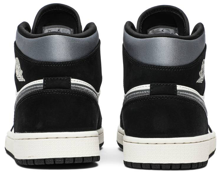 The Air Jordan 1 Mid SE Satin Smoke Grey showcases the timeless appeal of the AJ1 silhouette, updated here with a neutral color scheme and nontraditional materials. The upper is constructed from a blend of white leather at the quarter panel and shiny grey satin at the toe box, collar and Nike Swoosh. Black suede overlays are applied to the forefoot, heel and collar, the latter featuring a classic Wings logo on the lateral side.
