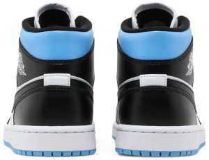 The Women’s Air Jordan 1 Mid “Black/White/University Blue” is a women’s exclusive version of Michael Jordan’s first signature shoe in a versatile colorway. In mid-top form, the “Black/White/University Blue” features white leather on the perforated toe and mid-panel. The forefoot, eyelets, collar, heel, and Swoosh are dressed in black leather. A white “Wings” graphic appears on the black leather overlay above the University Blue collar and a black Jumpman and “Air” logo can be found on the white nylon tongue tag. Underfoot, a white rubber midsole and contrasting University Blue outsole complete the look. | Wmns Air Jordan 1 Mid