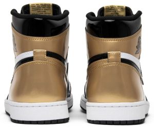 The Air Jordan 1 Retro High OG NRG Gold Toe features a black patent leather upper with distinctive metallic gold accents on the perforated toe box, tongue branding, and the heel panel. The high top also boasts a white side panel which extends from the midfoot to the heel, and a white rubber midsole. Other details include suede accents on the lacing structure, large Swoosh branding, and a tonal black outsole.