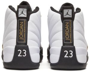 The Air Jordan 12 Retro ‘Royalty’ adds gilded accents to a two-tone design reminiscent of the OG ‘Taxi’ colorway from 1996. The mid-top makes use of a white tumbled leather upper with radiating stitch detailing and black lizard-textured overlays. Contrasting pops of metallic gold land on the molded top eyelets, midfoot TPU piece and the Jumpman and ‘Two 3’ branding embroidered atop the tongue. Responsive cushioning comes courtesy of a full-length Zoom Air unit. Underfoot, the outsole features rubber herringbone traction pods and a carbon fiber spring plate.