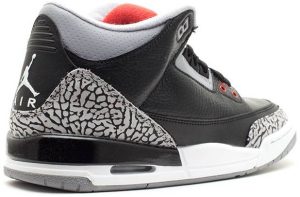 This is the grade-school edition of the Air Jordan 3 Retro ‘Cement,’ released in November 2011. Virtually all of the design hallmarks of the original are present on this model, including a black, tumbled leather upper, elephant-print overlays and a visible Air Sole unit in the midsole. An embroidered red Jumpman logo on the tongue is matched by a molded version of the logo on the heel.