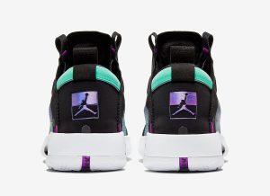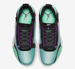 Sporting a mixture of Blue Void, Green Glow, Black, and Metallic Silver, the AJ 34 is defined by its transparent Eclipse plate that is light, while providing dynamic control. The sneakers grid patterned translucent upper reveals green hues underneath, while black and purple accents scattered throughout provide a solid touch of contrast. Finally, a custom white Zoom Air sole and traction pattern tops off the design, which is one of the lightest Air Jordans to date.
