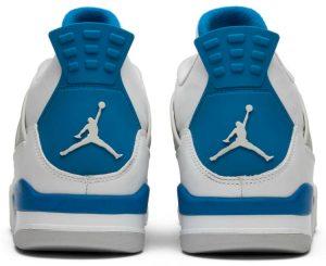 The Nike Air Jordan 4 Retro Military Blue 2012 is based on the 1989 Off-White/Military Blue OG colorway. The design combines a white leather upper with Military Blue and Natural Grey accents. Released in August 2012, the sneaker also features Jumpman branding at the tongue and heel.