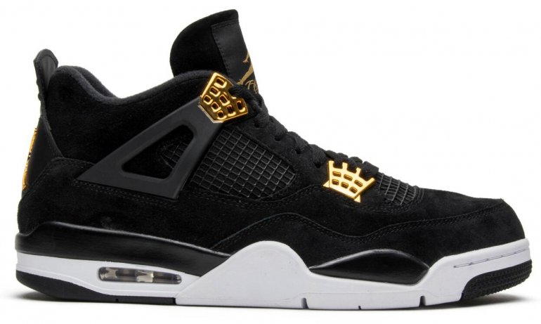 The Air Jordan 4 Retro ‘Royalty’ pairs a monochromatic black suede upper with contrasting metallic gold accents. They shine on the signature molded eyelets and a Jumpman icon on the synthetic leather heel panel. Additional Jumpman branding lands on the woven tongue tag and rubber outsole, featuring a traditional herringbone traction pattern for optimal grip. Lightweight cushioning is provided by a polyurethane midsole, enhanced with a visible Air sole unit under the heel.