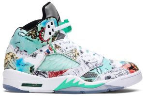 Due to the positive role educators played in Michael Jordan’s formative years, he founded Wings, a scholarship fund dedicated to giving young people equal access to a quality education. The ‘Wings’ edition of the Air Jordan 5 honors this mission by covering the leather upper in doodles and drawings by students from Little Black Pearl, a nonprofit art and design center serving the youth of Chicago’s South Side. The Jordan ‘Wings’ logo appears on the underside of the tongue, next to the statement ‘Everyone Can Fly.’
