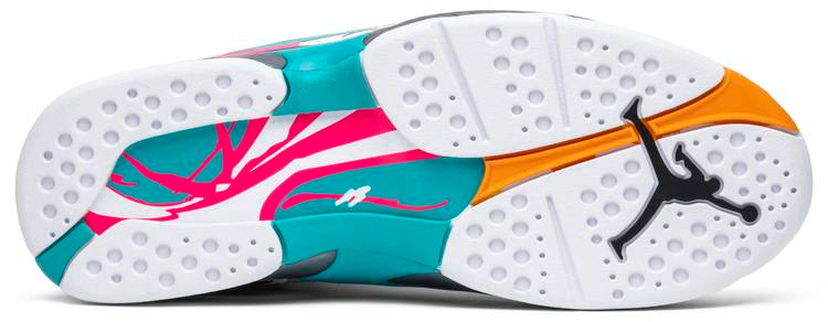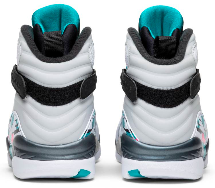 The Air Jordan 8 Retro ‘South Beach’ earns its unofficial moniker through a color scheme that presents a radical departure from the silhouette’s OG Chicago Bulls colorways. A white leather upper – featuring perforated paneling on the quarter panel – is accented with overlays adorned with streaks of Turbo Green and pink. The AJ8’s signature chenille tongue patch is similarly done up in teal, pink and orange.