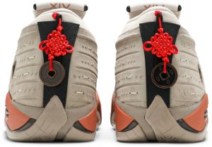 Developed in partnership with Edison Chen’s streetwear brand, the CLOT x Air Jordan 14 Retro Low ‘Terracotta’ is the follow-up effort to the Air Jordan 13 Low ‘Terracotta’ from 2018. Like its predecessor, the low-top features a tan suede upper with embossed detailing that mimics protective armor — a nod to the thousands of life-size clay soldiers buried alongside the first emperor of China. Mismatched Jordan and CLOT branding adorns the tongue, designed to mimic an unfurled ancient scroll. Hanging off the heel is red Chinese knot, the end of which is threaded through a coin that’s stamped with a Chinese idiom for prosperity and happiness.