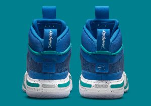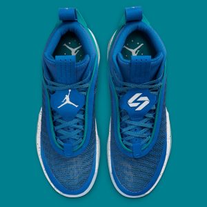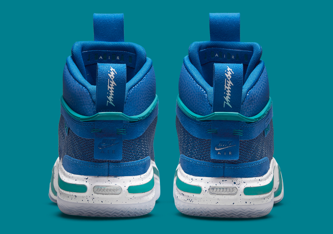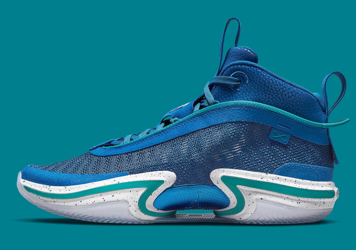 Launching exclusively in Asia, Latin America and Europe, the Air Jordan 36 ‘Slovenia’ is a PE colorway made for Luka Doncic. The performance hoops shoe makes use of a blue leno-weave upper with tonal synthetic overlays and a teal-colored TPU ribbon that wraps around the throat and heel. A pull tab atop the tongue connects to a lace cover inspired by the Air Jordan 6, featuring Jumpman branding on the right shoe and Luka’s personal logo on the left. Performance benefits include a full-length Zoom Air Strobel and a Zoom Air unit stacked under the forefoot. A midfoot shank is exposed via a hollowed-out portion of the speckled foam midsole, which is reinforced by a translucent herringbone-traction rubber outsole.
