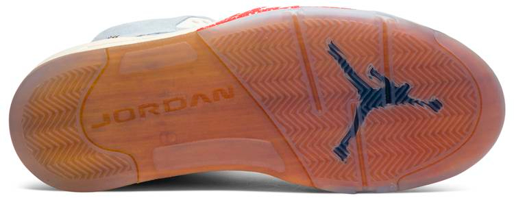 The Trophy Room x Air Jordan 5 Retro sneaker draws inspiration from the real-life trophy room in the Jordan family home. This Ice Blue rendition is replete with a rich suede upper, hits of University Red, Sail and a metallic gold lace lock. Each lateral heel is embroidered with metallic gold numerals—23 and 5—the jersey numbers worn by MJ and his son, Marcus. Below, the sneakers translucent rubber sole displays a wood-grain motif to reference the court-style flooring in MJs trophy room. A total of 7,000 pairs were released in May 2019, each individually numbered.