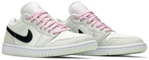 Suede sole The Women’s Air Jordan 1 Low “Barely Green” is a women’s exclusive makeup of Michael Jordan’s first signature shoe that combines textures and colors in a unique way to tell its story One of the more unique Jordan 1 Low designs in the line, the “Barely Green” features mint green canvas on the perforated toe, mid-panel, and collar The same Barely Green hue appears on the leather forefoot and eyelets A slightly darker shade of green is used on the suede heel A black tumbled leather Swoosh breaks up the earthy look on both sides and a pink “Wings” logo is embroidered on the back of the shoe. The Jumpman, shoelaces, and “23” embroidery contrast the look of the white nylon tongue The Women’s Air Jordan 1 Low “Barely Green” is a women’s exclusive makeup of Michael Jordan’s first signature shoe that combines textures and colors in a unique way to tell its story. One of the more unique Jordan 1 Low designs in the line, the “Barely Green” features mint green canvas on the perforated toe, mid-panel, and collar. The same Barely Green hue appears on the leather forefoot and eyelets. A slightly darker shade of green is used on the suede heel. A black tumbled leather Swoosh breaks up the earthy look on both sides and a pink “Wings” logo is embroidered on the back of the shoe. The Jumpman, shoelaces, and “23” embroidery contrast the look of the white nylon tongue. A white midsole and Barely Green colored outsole finish off the look of this casual Air Jordan 1 Low for women.