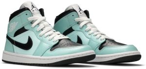The Women’s Air Jordan 1 Mid “Aqua/Black” is a women’s-exclusive colorway of the mid-top lifestyle shoe by Jordan Brand. The Air Jordan 1 Mid is an alternate silhouette based on the original high-top version of Michael Jordan’s first signature shoe by Nike and is one of the most popular women’s sneakers in the world. On this colorway, teal-colored leather panels appear on the forefoot, eyelets, collar, and heel. A slightly lighter shade of teal or aqua leather can be found on the mid-panel underneath the black leather Swoosh detailing. A white “Wings” logo appears on the collar and a black Jumpman with “Air” branding can be found on the tongue tag on the white nylon tongue. Additional design details include a black leather collar, white laces, and a white midsole and contrasting black outsole. | Wmns Air Jordan 1 MID Light Dew.